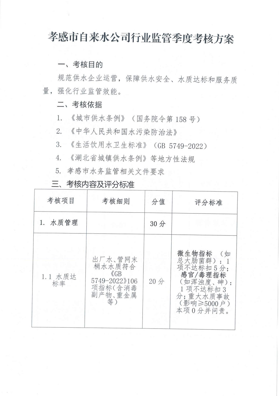關于印發《孝感市自來水公司行業監管季度考核方案》的通知